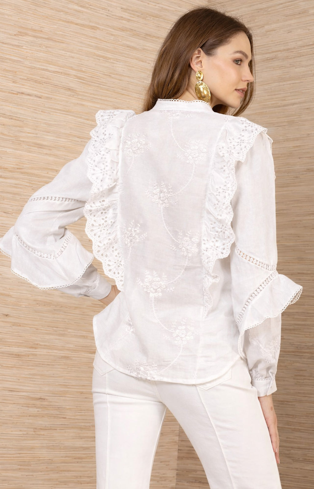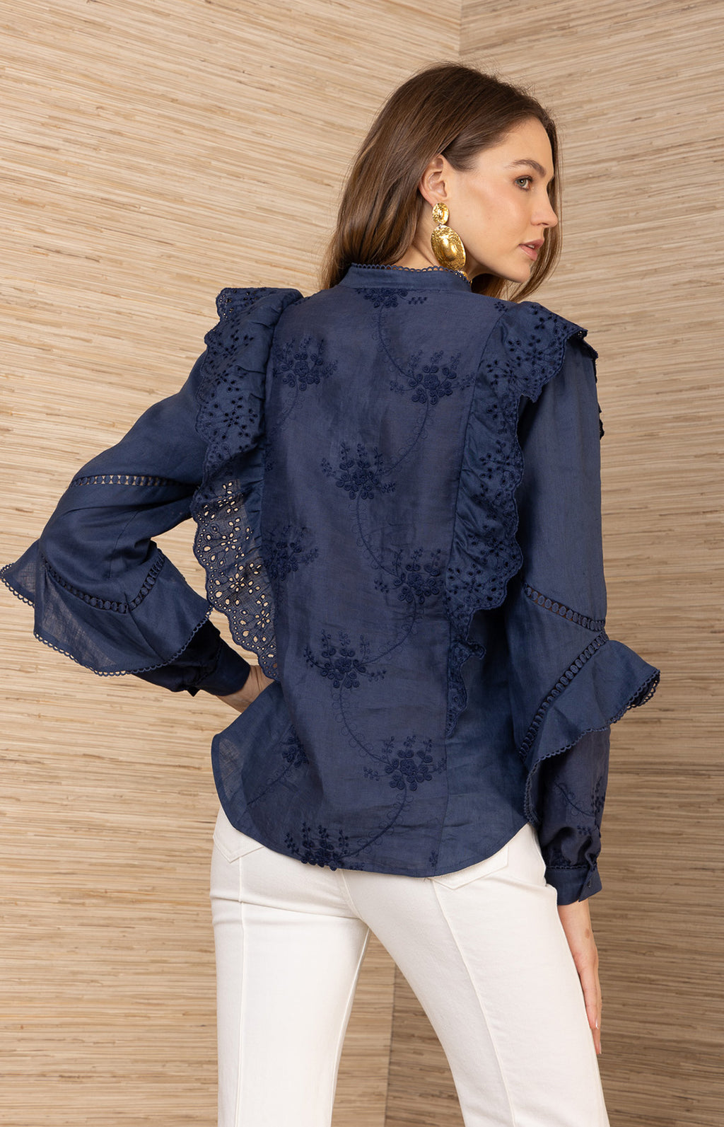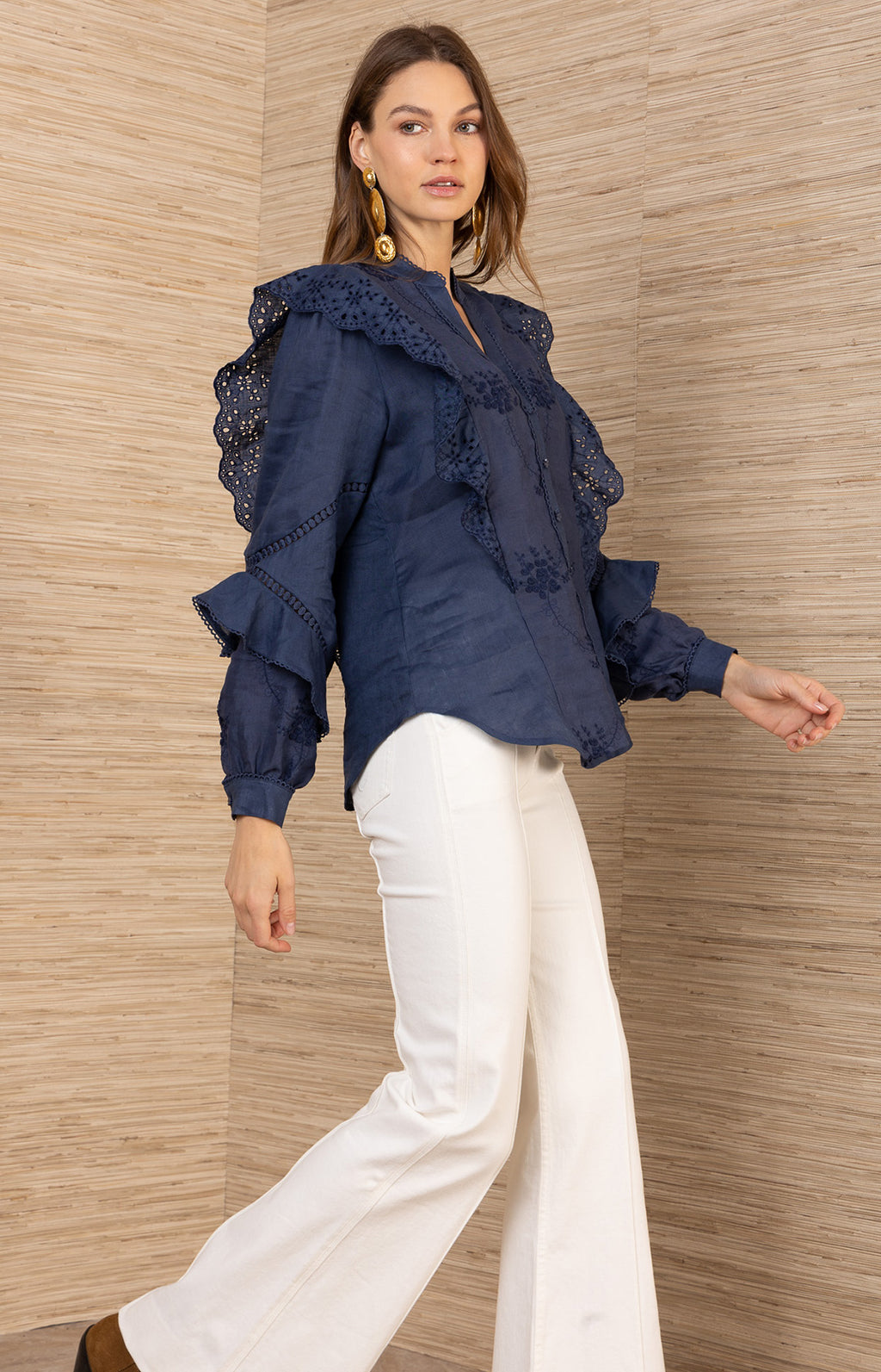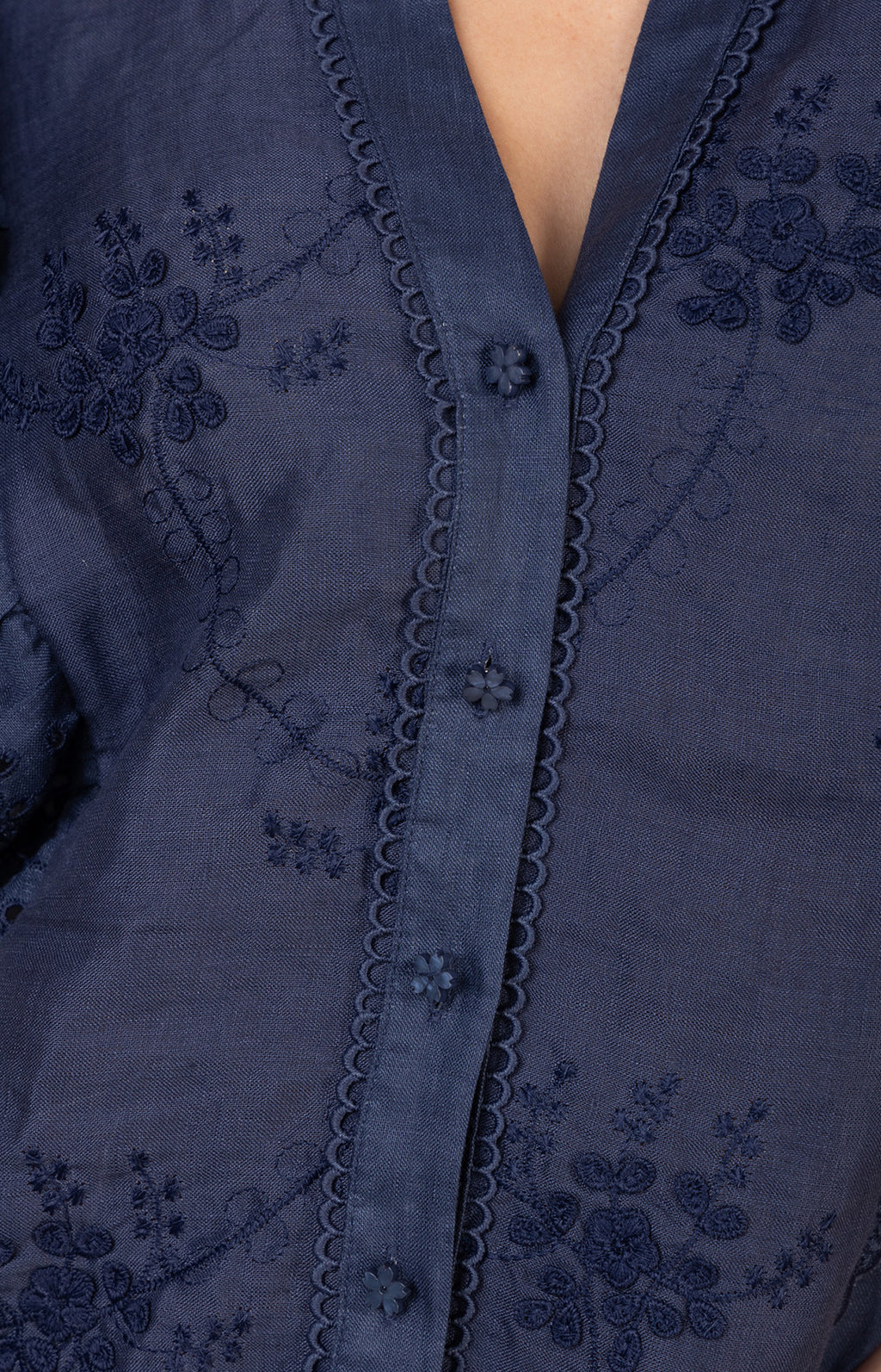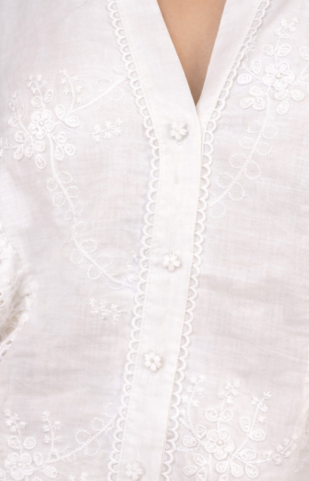 Designed in soft washed linen, this embroidered blouse is finished with button-front styling and subtle eyelet trim.